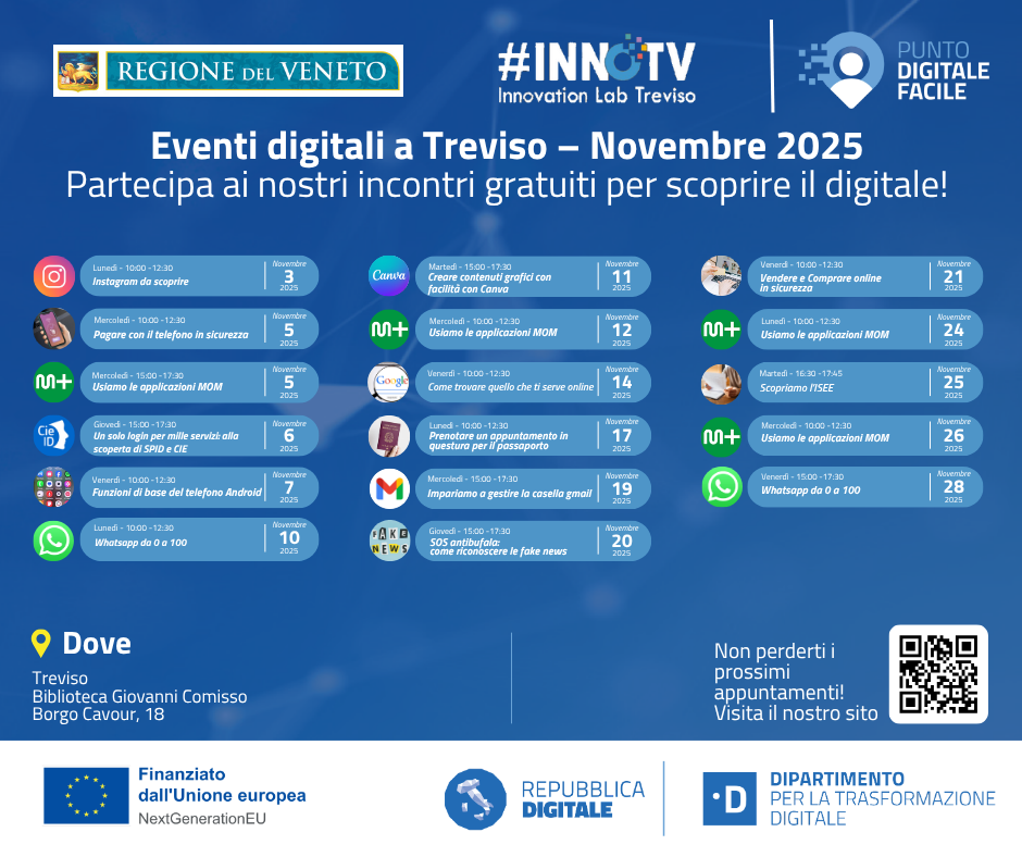 Anche nel mese di novembre 2025, la Biblioteca Giovanni Comisso di Treviso propone una nuova serie di incontri gratuiti pensati per chi vuole scoprire come la tecnologia può semplificare la vita di tutti i giorni.