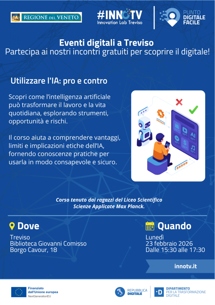 Unisciti a noi per un incontro gratuito e scopri come l’intelligenza artificiale sta trasformando il nostro lavoro e la vita quotidiana! Lunedì 23 febbraio 2026, dalle 15:30 alle 17:30, alla Biblioteca Giovanni Comisso di Treviso, esploreremo insieme gli strumenti, le opportunità e i rischi legati all’uso dell’IA. Il corso, tenuto dai ragazzi del Liceo Scientifico Scienze Applicate Max Planck, offre una panoramica pratica sui vantaggi e le implicazioni etiche dell’intelligenza artificiale, insegnandoci ad usarla in modo consapevole e sicuro. Non perdere questa occasione di aggiornamento e formazione!