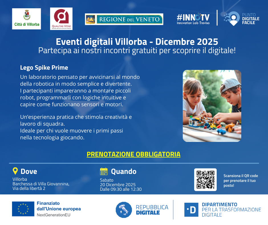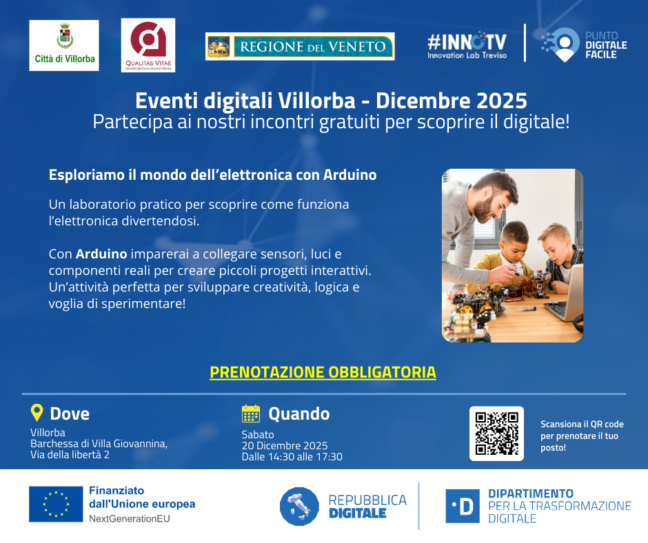 Sabato 20 dicembre 2025 la Barchessa di Villa Giovannina ospita due nuovi appuntamenti gratuiti del programma Punto Digitale Facile, dedicati alla robotica e al mondo dell’elettronica.